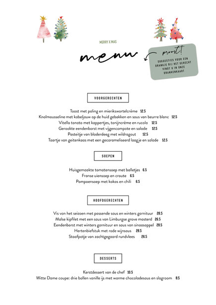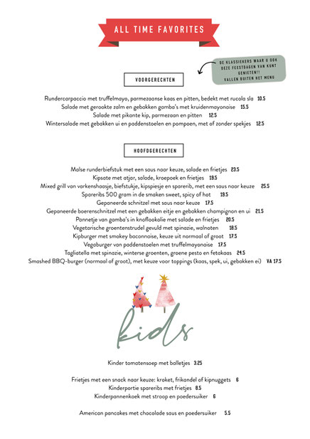 Aansluitend starten we met het Kerstdiner, reserveren kan vanaf 15 uur. We bieden ter plaatse keuze uit ons Kerstmenu of de aangepaste normale menukaart (zie hieronder). Groepen vanaf 10 personen vragen we om vooraf de keuzes door te geven.